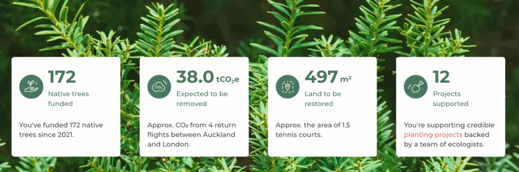 We’re working with Trees That Count to help mitigate our carbon footprint over the next 50 years. This will help to protect New Zealand’s threatened biodiversity. We do this by funding native trees to be planted in our beautiful area, as you can see by the tally above. That’s good for our carbon footprint, and for Aotearoa.